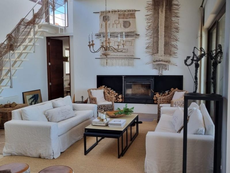 Hall de acceso, living, comedor con chimenea empotrada, con una gran terraza en el techo, más terraza techada y quincho integrado con vista al mar.